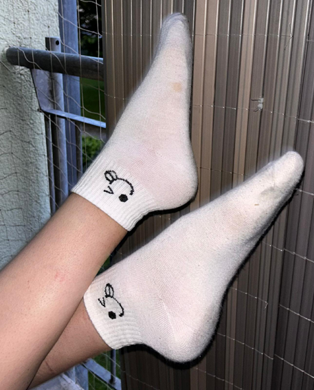 weiße Socken mit Motiv am Bund, extrem schmutzig,den ganzen tag im Haus ohne Schuhe getragen